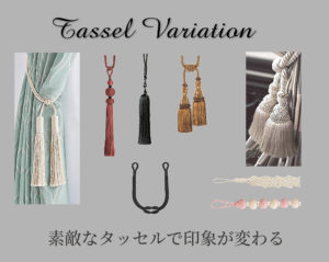 タッセルを変えるとカーテン周りの印象がぐっと変わり、窓辺の空間がグレードアップします。エレガントなものから可愛らしいものまで多数ご用意できます。